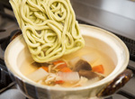 長命草うどんを、土鍋でたっぷりの野菜とともに煮込みます。